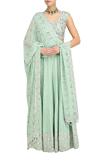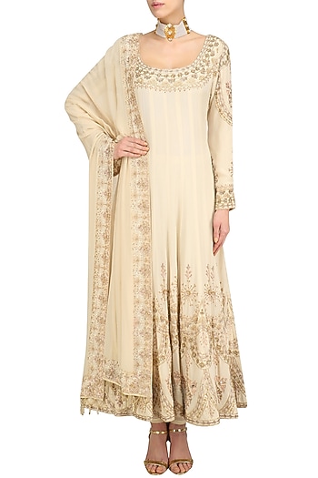 Anushka Khanna Dresses / Beige sequin embroidered anarkali and churidaar set.