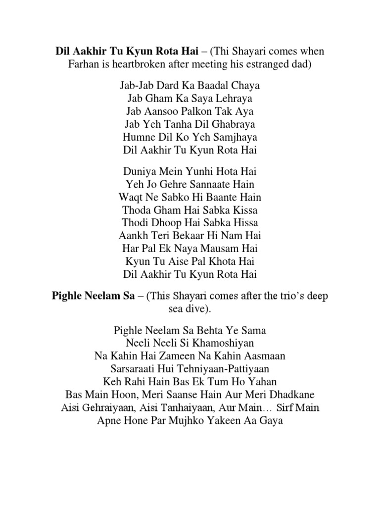 Zindagi Na Milegi Dobara Poetry English Translation Znmd - Duniya mein yunhi hota hai.