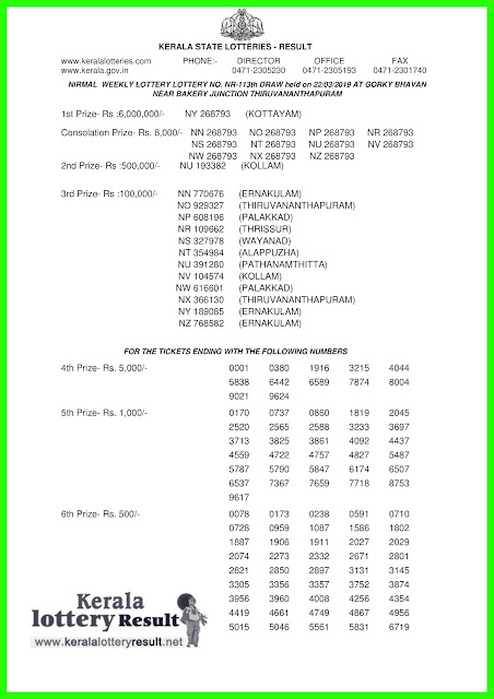 Nirmal Lottery Nr 113 Result 22 3 2019 Kerala Lottery Nirmal Nr Results Nirmal Lottery Result - We are providing result of each kerala lottery within half an hour when the draw completes.