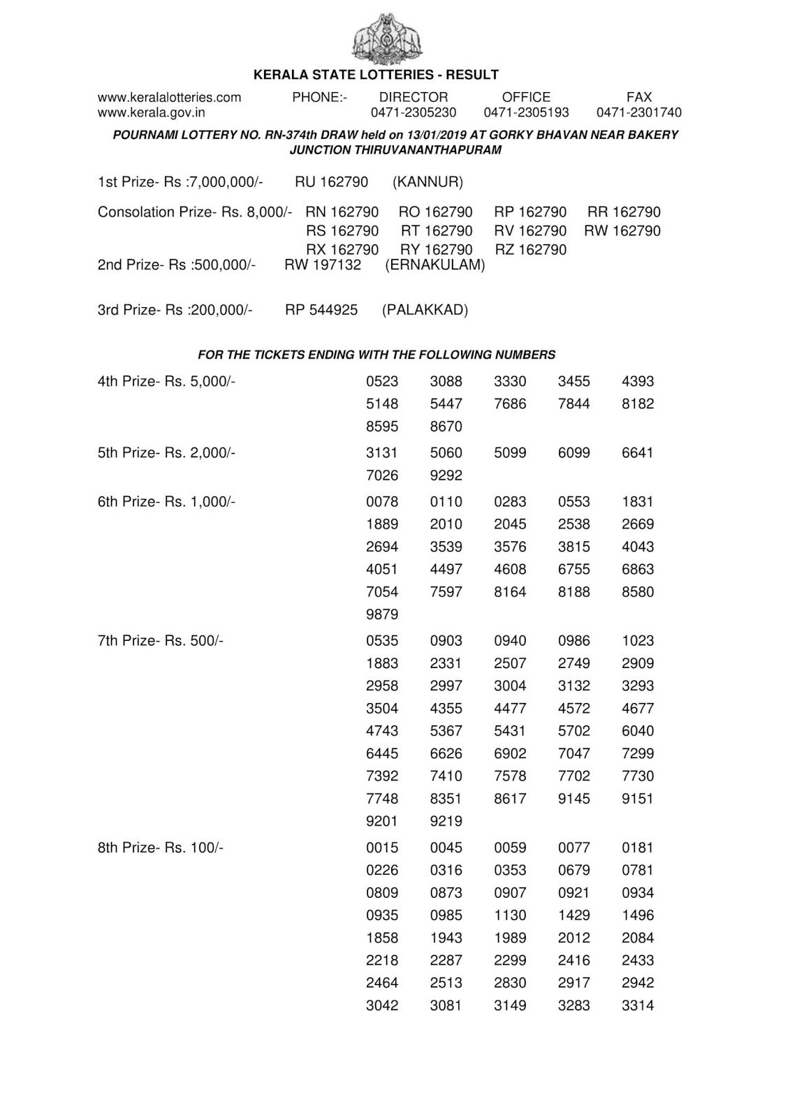 Rn Lottery - Result of pournami rn 374 lottery draw held on 13/01/2019 at sree chithra home auditorium, pazhavangadi, east fort, thiruvananthapuram by kerala lottery department.