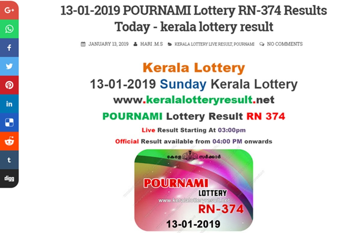 Kerala Lottery Result Today Pournami Rn 374 Live 13 01 2019 Sunday - Latest results for the pournami lottery draw of the kerala state lottery, along with all previous pournami results from the last six months.